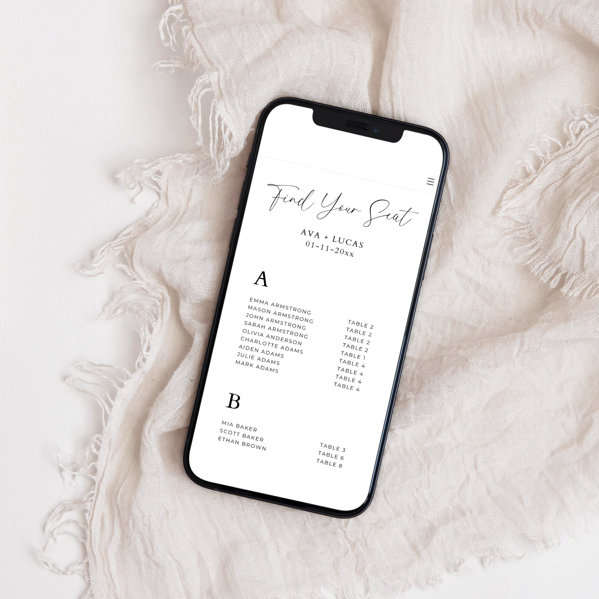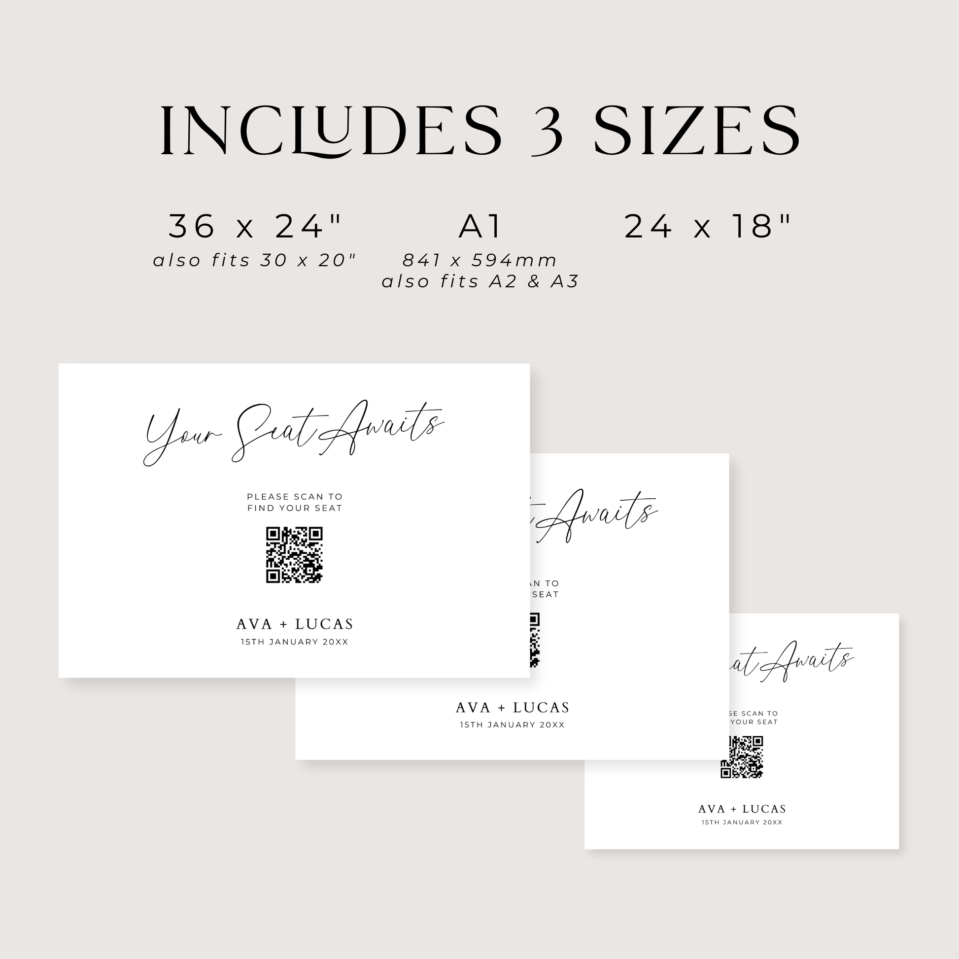 Simplify your seating process with this Minimalist QR Code Digital Seating Chart Template. Guests can scan the QR code to access an alphabetical list of names and assigned tables, perfect for keeping your wedding or event organized. A video tutorial is included to guide you through editing and linking the sign and website together.