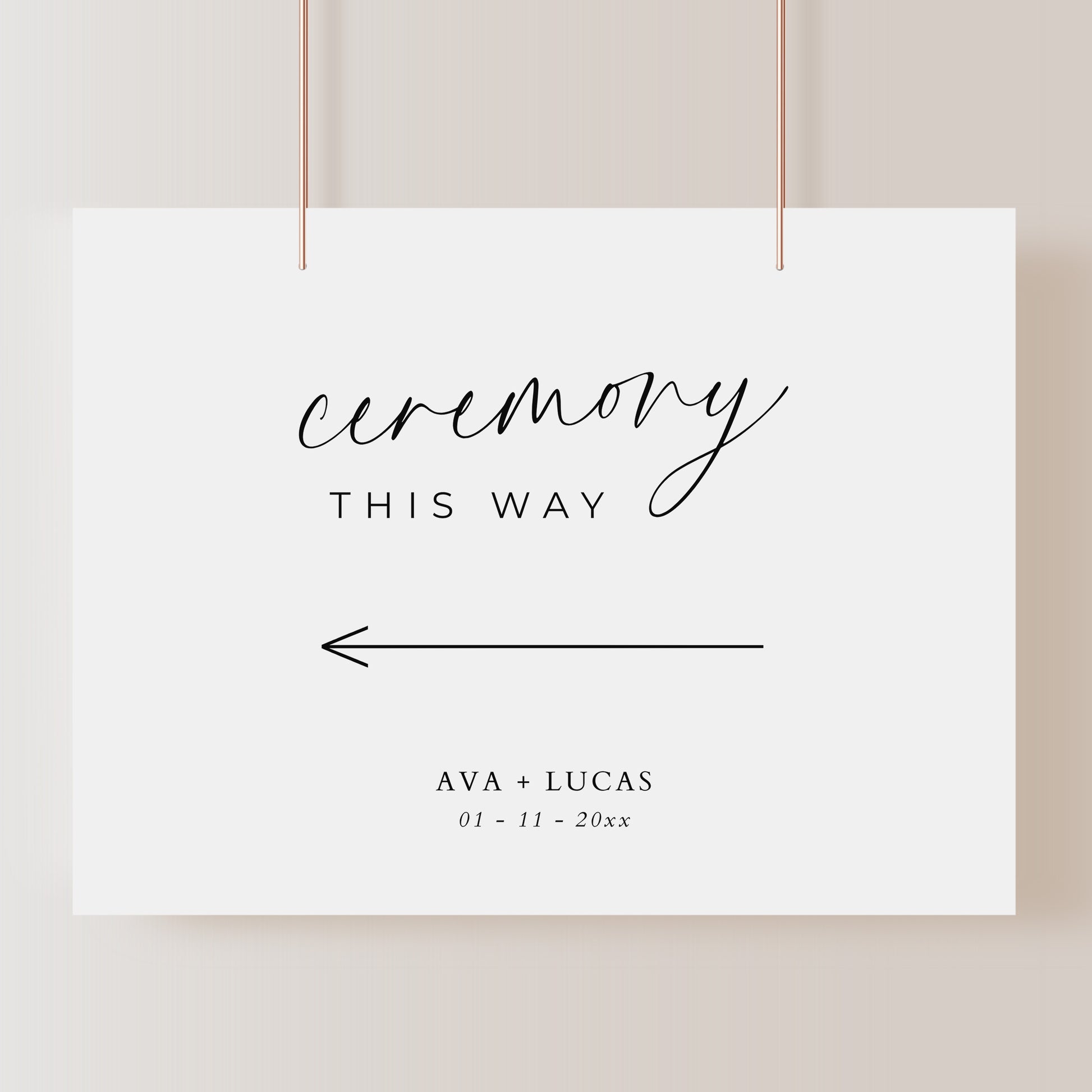 Guide your guests using our Wedding Ceremony This Way Sign, perfect for outdoor weddings or larger venues. This minimalist design features a clear directional arrow, helping attendees find their way to your ceremony space without confusion.